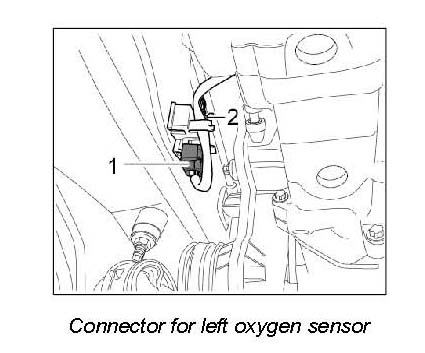 29. Unclip electric plug connections -1- for the oxygen sensors on the left and right transverse bar from the brackets. Unclip the lead -2- from the bracket. Release and disconnect plug connections.
