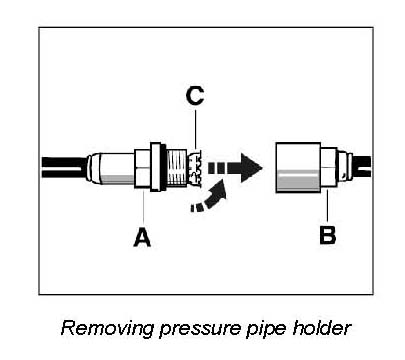 42. Tilt holder on one side -C, arrow- and simultaneously pull to disengage. Detach nipple from the pipe and remove the old O-ring. Close off line.