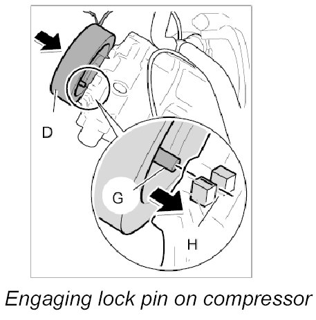 1. Place the magnetic coil -D- on the compressor housing. The locking pin -G- must engage in the locking hole -H-.