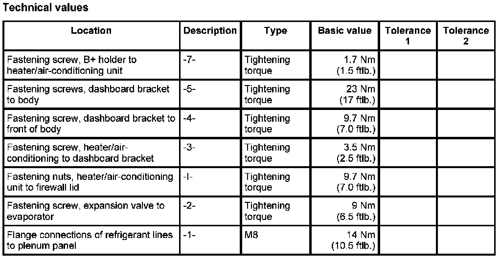 15. Screw down holder of heater/air-conditioning unit with the fastening screw -3-. Tightening torque: 3.5 Nm (2.5 ftlb.)
