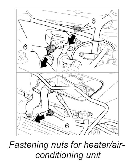 16. Slide the fastening bolts of the heater/air-conditioning unit through the firewall lid and tighten with the three fastening nuts -6-. Tightening torque: 9.7 Nm (7.0 ftlb.)