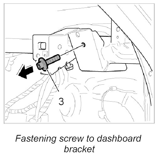5. Unscrew fastening screw -3- for securing holder of the heater/air-conditioning unit to right side of dashboard bracket (next to A-pillar).