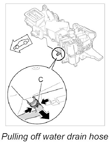 12. Lay down the air conditioner, release clamp for water drain hose -C- and pull off the water drain hose from the heater/air-conditioning unit.