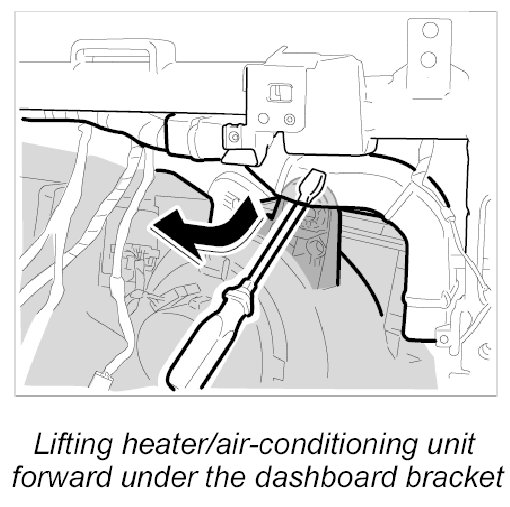 13. Carefully lift heater/air-conditioning unit forward with a screwdriver under the right side of the dashboard bracket.