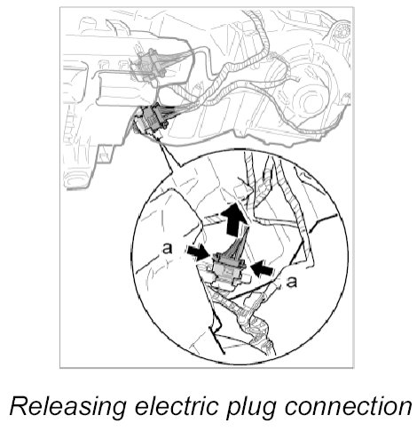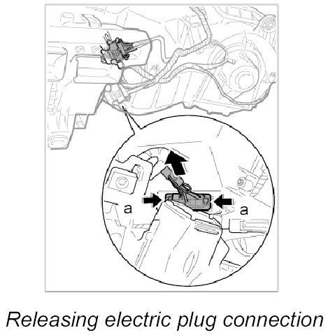 15. Release upper plug connection on heater/air-conditioning unit -a- and unplug.