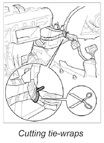 16. Cut tie-wraps of electric line (vehicle wire harness to heater/air-conditioning unit wire harness) with side cutters. Remove vehicle wire harness.