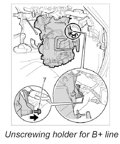 17. Pull air conditioner forward on the right side, unscrew fastening screw -7- for B+ line holder and remove holder for heater/air-conditioning unit.