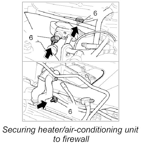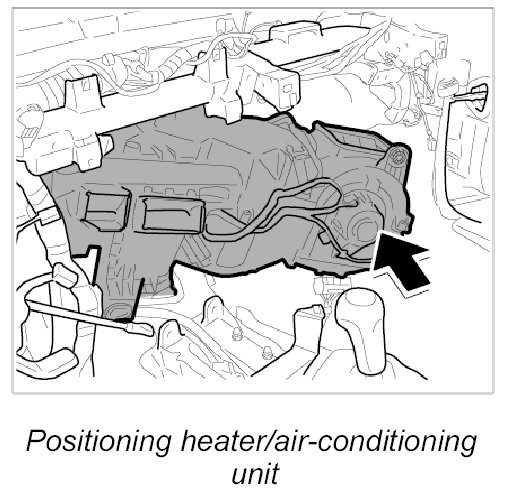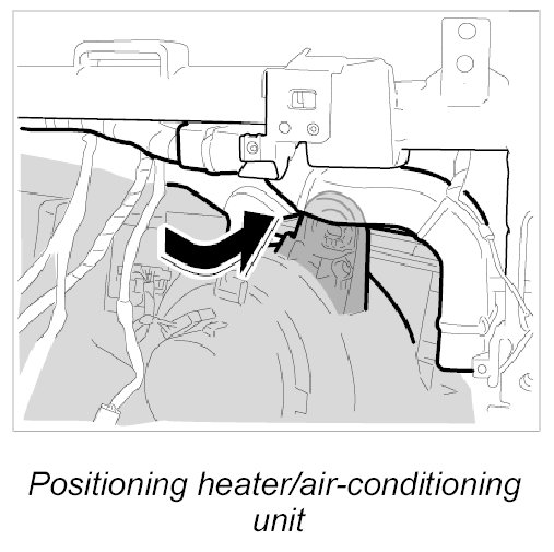 2. Lift heater/air-conditioning unit over the centre console and position under dashboard bracket.