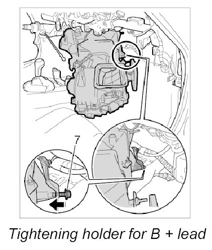 3. Position holder for the B+ line on the heater/air-conditioning unit and tighten with the fastening screw -7-. Tightening torque: 1.7 Nm (1.5 ftlb.)