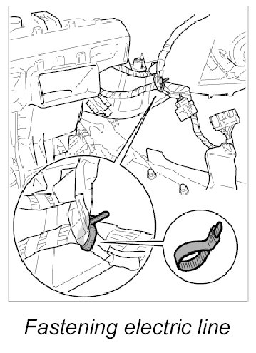 4. Lay electric line from vehicle wire harness to heater/air-conditioning unit wire harness and fix with a tie-wrap.