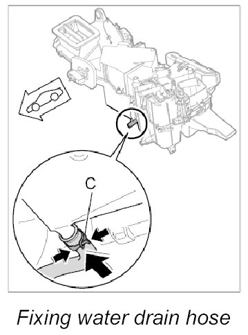 7. Check water drain hose for damage; if drain hose shows no sign of damage, connect hose to the drain on heater/air-conditioning unit and fix with the clamp -C-.