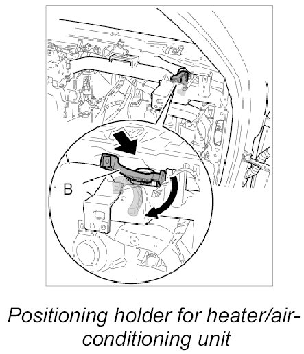 9. Guide holder -B- for the heater/air-conditioning unit over the dashboard bracket, push through the mounting of the heater/air-conditioning unit and turn through 90 degrees.