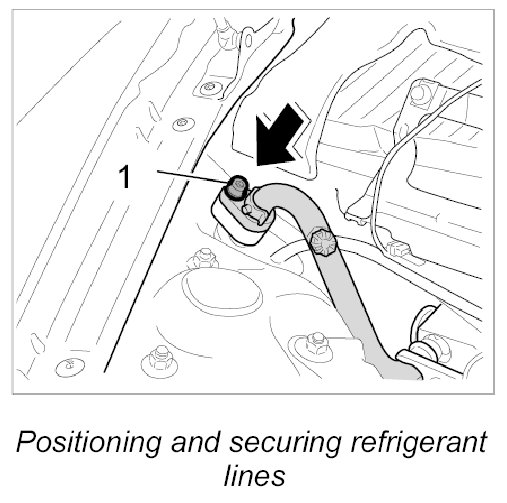 18. Replace sealing rings for refrigerant lines and wet with refrigerant. Position refrigerant line and tighten with fastening screw -1-. M8: 14 Nm (10.5 ftlb.)