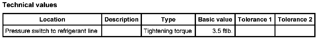 1. Screw pressure switch onto refrigerant line and tighten with an open-ended wrench. Counter with a second open-ended wrench. Tightening torque: 3.5 ftlb.