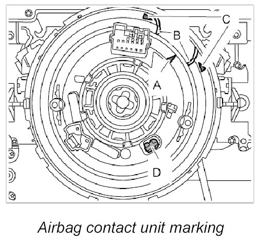 INFORMATION: Ensure that arrow -A- on the rotor is positioned between the markings -B- of the arrows -C- on the airbag contact unit and that the locking element -D- is engaged.