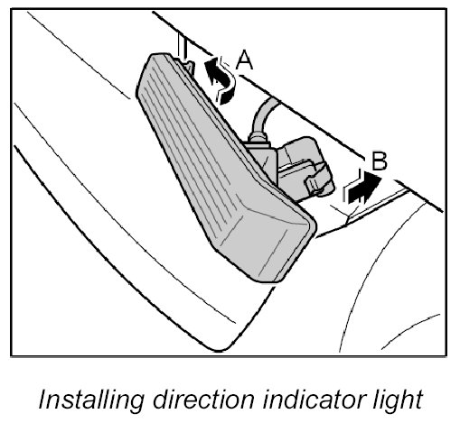 4. Engage the direction indicator light in the front apron -A- and clip it in -B-.