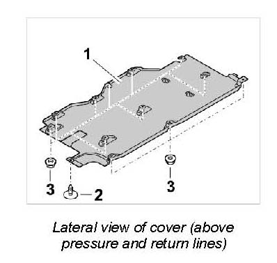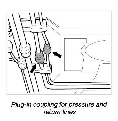The steering return line -1- is fitted on the steering gear and also on the plug-in coupling (connection point) in the rear sill area.