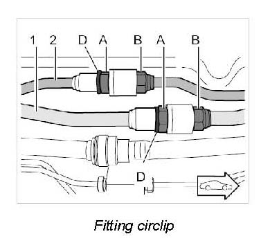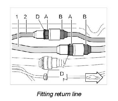 1.1. Remove circlip -D- from return line (thicker line) -1-. Loosen plug-in coupling (screw on). When loosening, turn at the threaded joint -A- and counter at the hexagon on the plug-in coupling -B-.