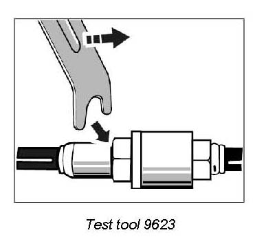 2.2. Check that the plug-in coupling is engaged correctly using special tool test tool 9623. Insert special tool into the groove and check that the connector is seated correctly in the plug-in coupling by applying slight pressure. The connector must not slide out. The plug-in coupling is designed so that there is axial play of approx. 1 mm in the plug-in coupling.