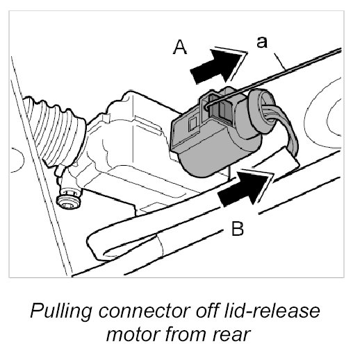 1.1. Release connector on motor for lid-release with suitable auxiliary materials (e.g.. angled piece of wire with diameter of approx. 1mm) -a- -arrow A- and pull off -arrow B-.