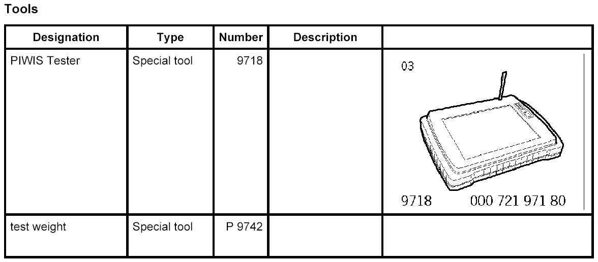 11.1.2. Place the special tool test weight P 9742 on the passenger's seat. The Passenger Airbag Off indicator light in the centre console must come on. Compare values (see table below) using the PIWIS Tester.