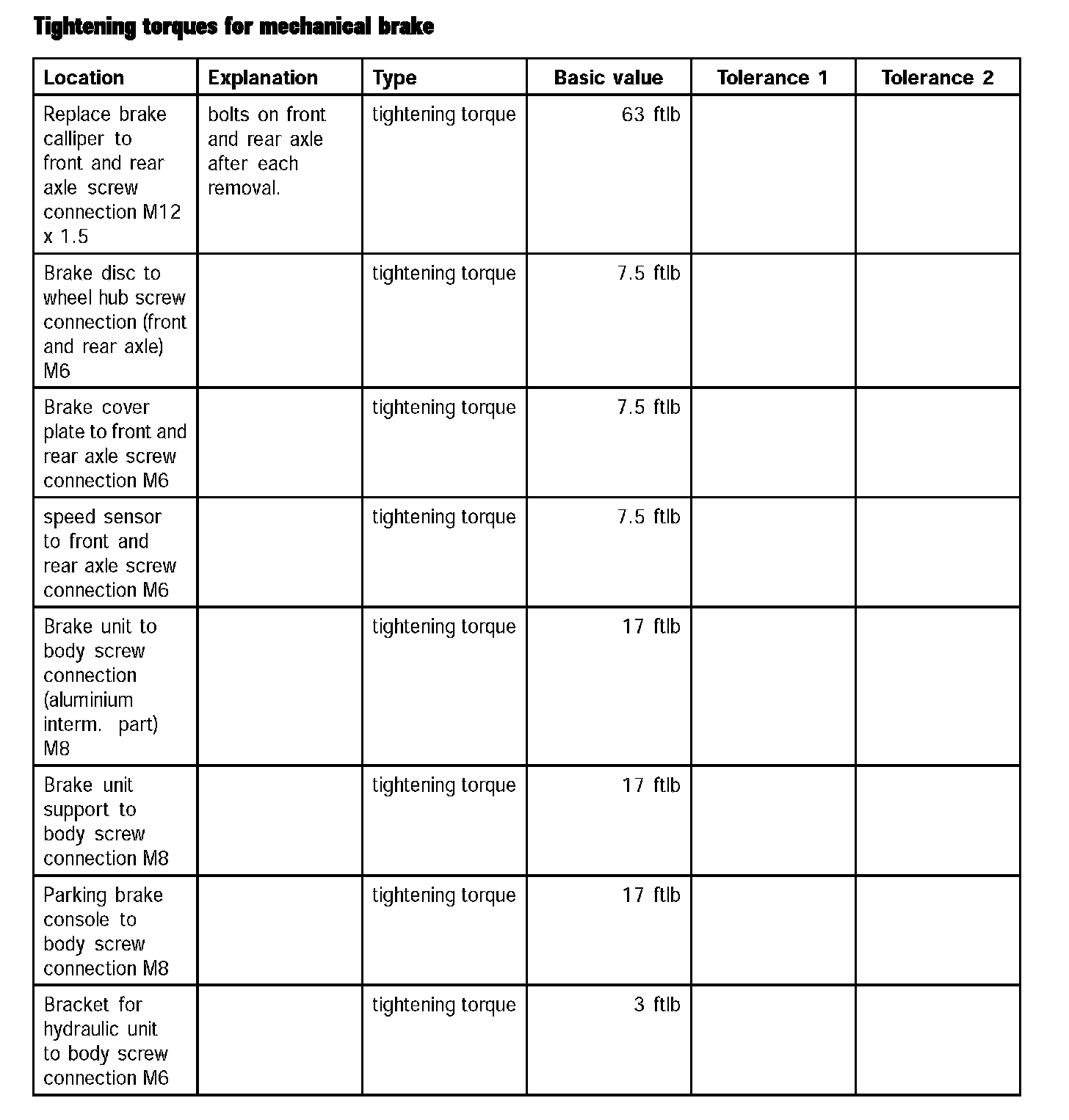 Tightening torques for mechanical brake (Part 1):