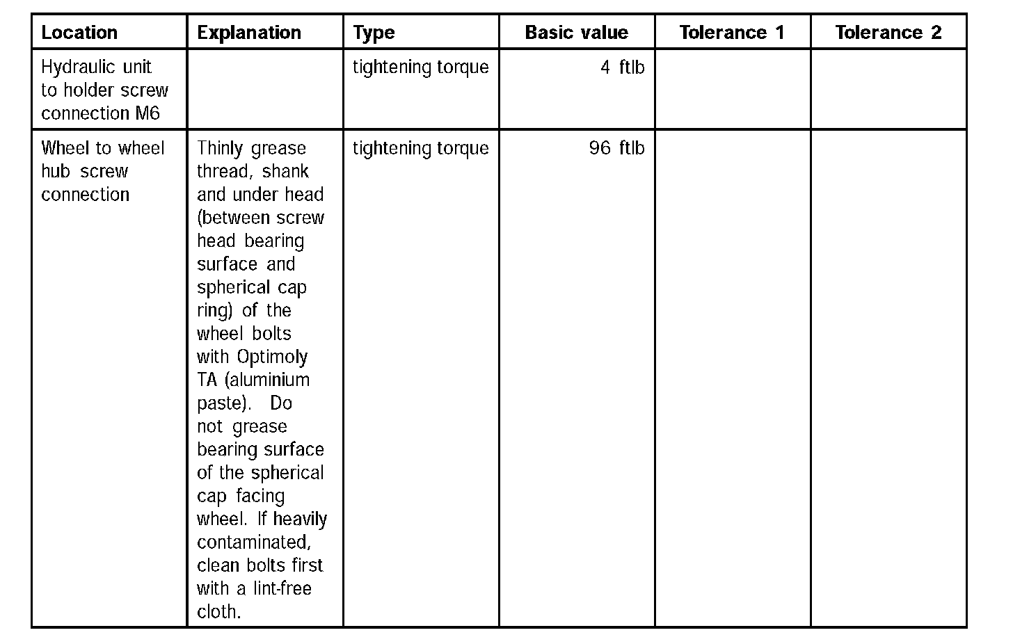 Tightening torques for mechanical brake (Part 2):