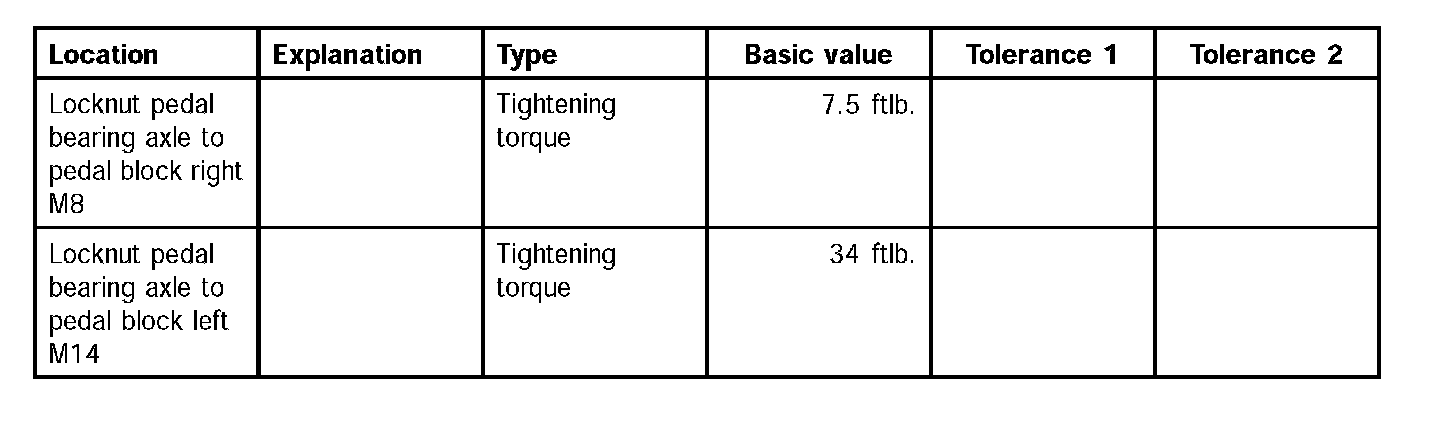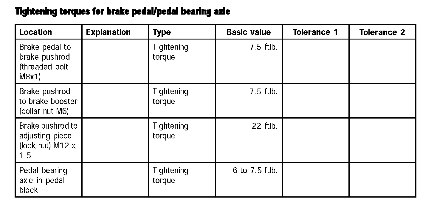 Tightening torques for brake pedal/pedal bearing axle