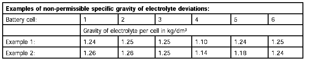 The measured values for the gravity of electrolyte of the individual battery cells should not deviate by more than 0.03 kg/cu.dm from each other.