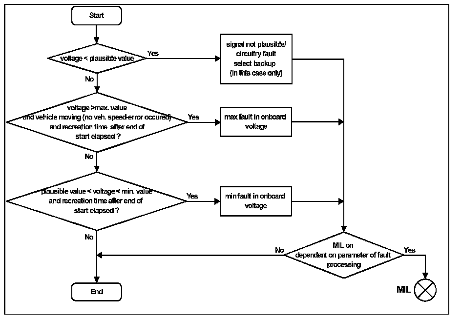 The check of the min. value (fault in the vehicle's electrical power supply system) is only allowed after a delay time from the end-of-start, when the voltage has recovered from the starter activation.