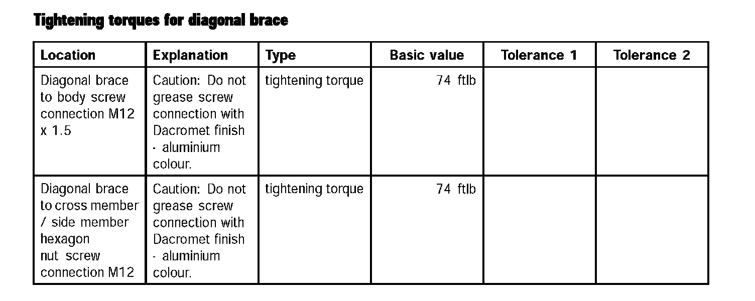 Tightening torques for diagonal brace: