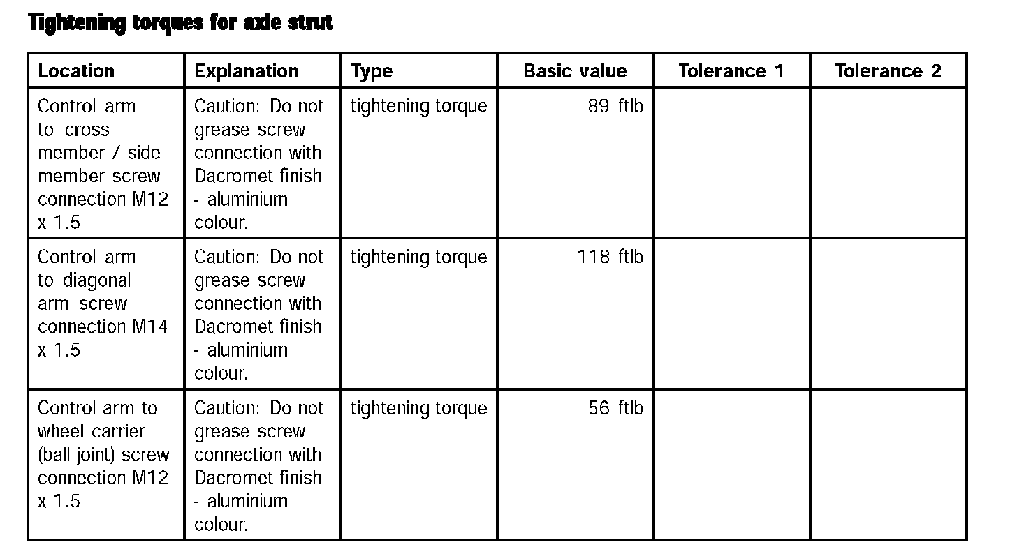 Tightening torques for axle strut: