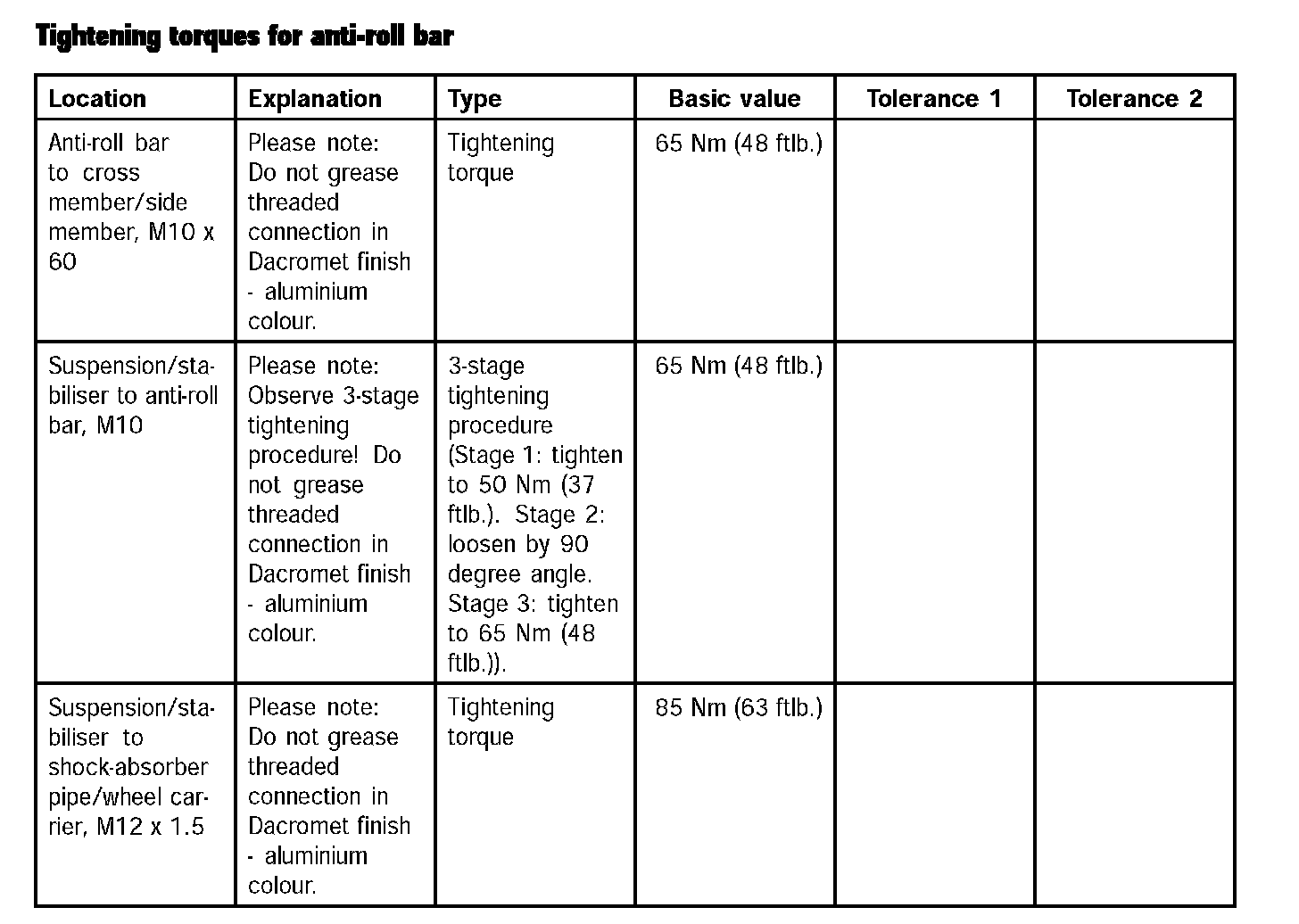 Tightening torques for anti-roll bar