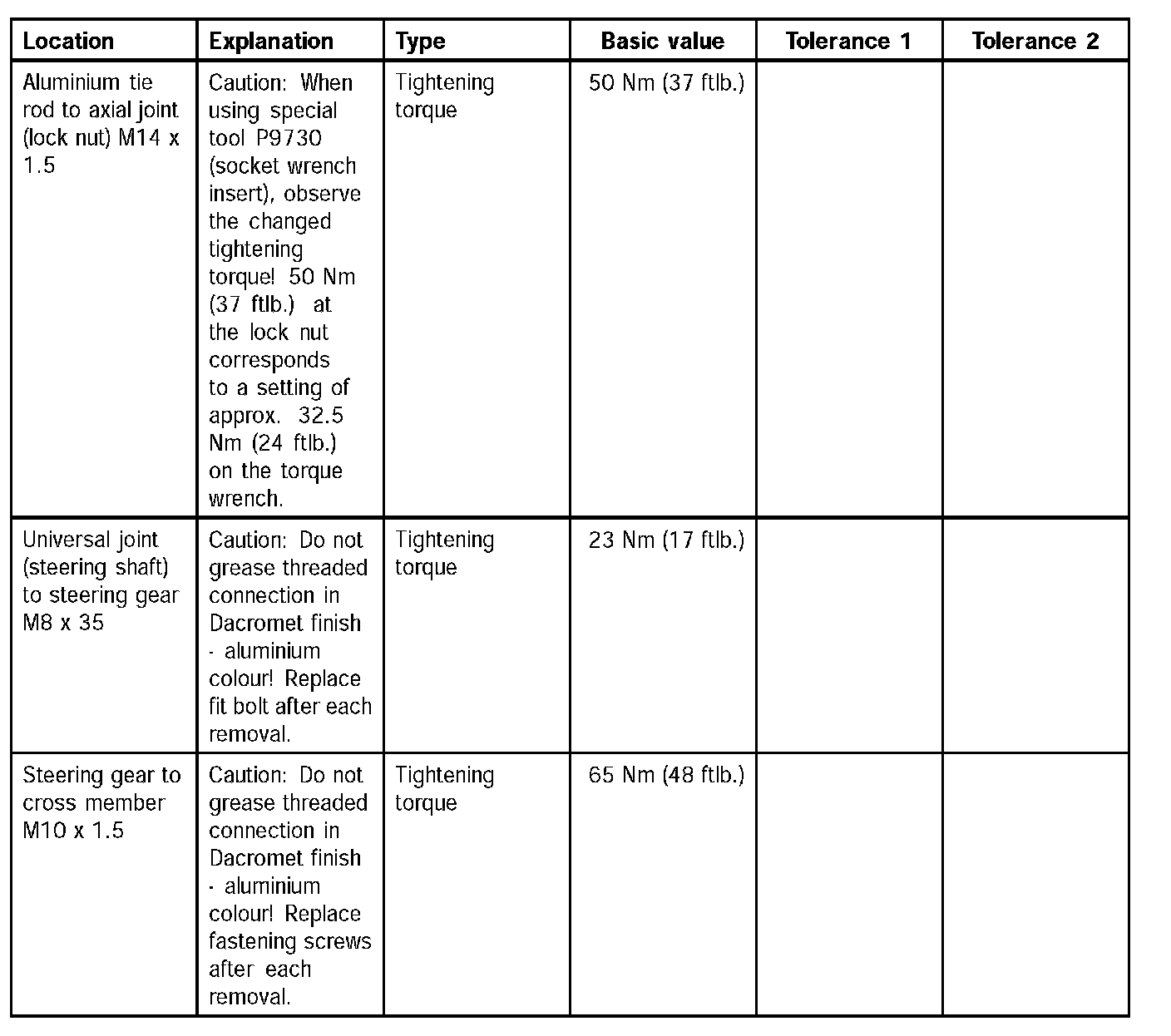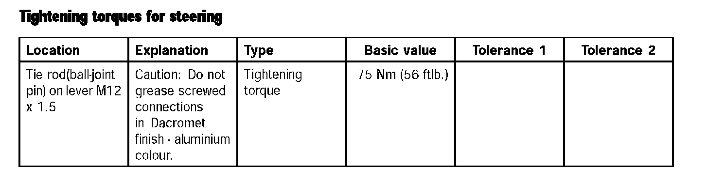 Tightening torques for steering