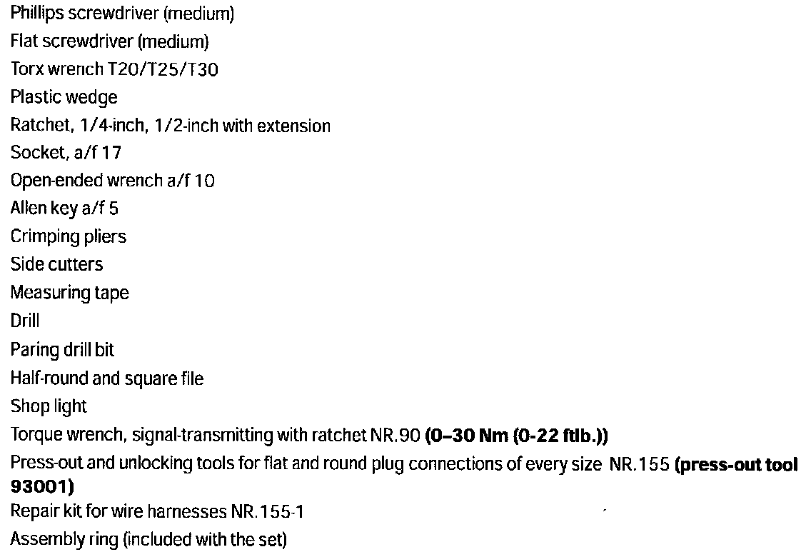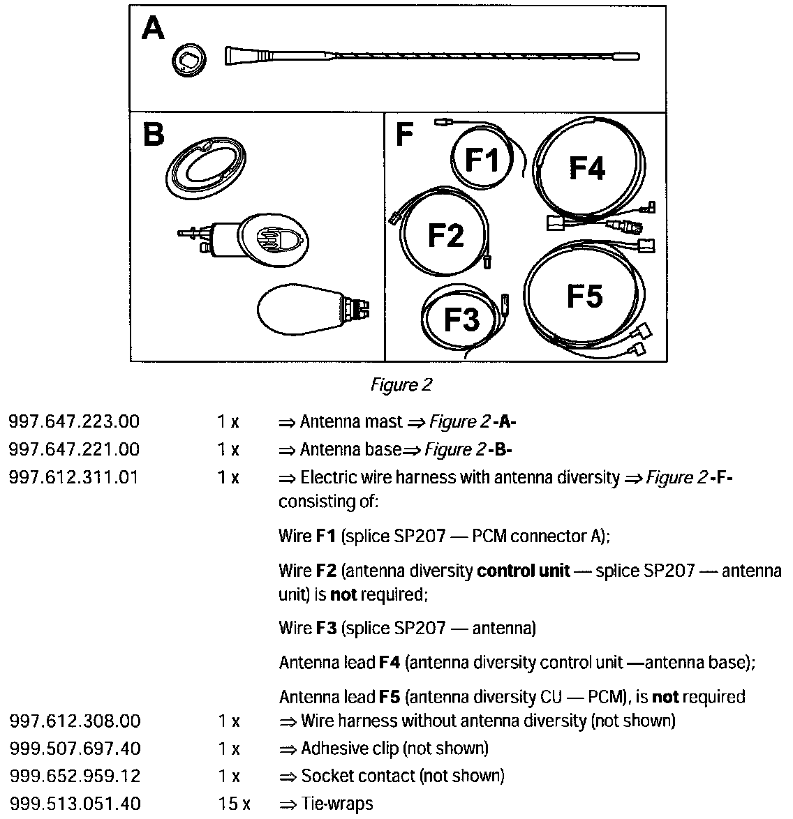 The electric wire harness including antenna diversity, is already factory installed on vehicles with PCM or CDR24. The wires F2 and F5 (see Parts List) are not required for the electric wire harness with antenna diversity. The template shown with dimensions for the cut-out of the antenna base is part of the TI. This mast antenna can also be ordered ex-works using I No. 461.