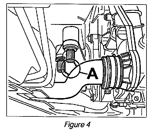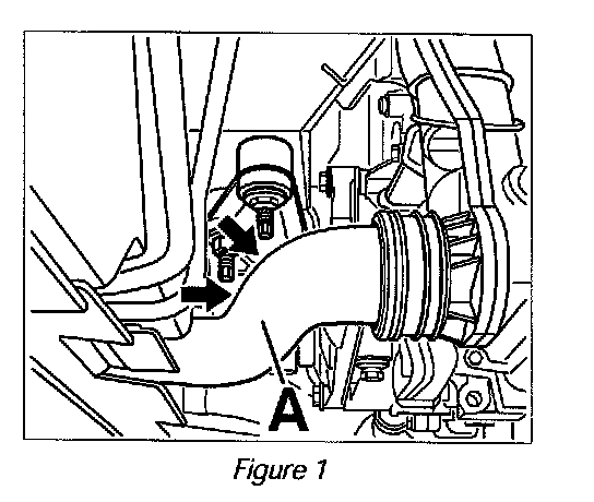 3. Check coolant hose (--> Figure 1 -Item A-) close to the two left studs for the engine carrier (--> figure 1-Arrows-) for damage (visible pressure points or chafing damage).