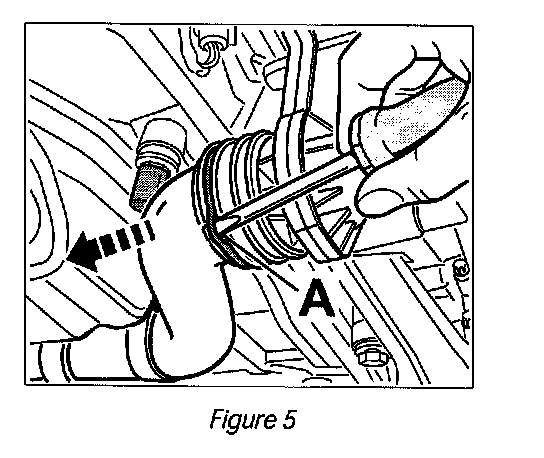 6.3 Disconnect coolant hose (supply) at the Henn coupling connecting it to the engine. To do this, use a screwdriver to release the spring clamp (--> Figure 5-Item A-) and pull the coolant hose off the Henn coupling (--> Figure 5-Arrow-).