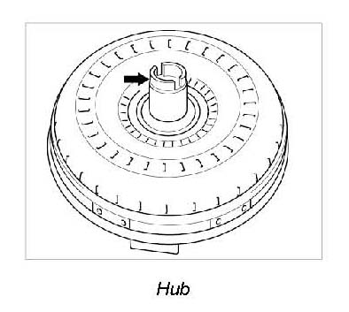 Before installing the torque converter, check the hub for scoring. If damaged, the converter must be replaced.