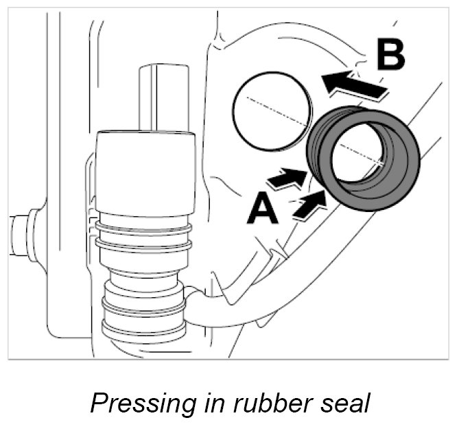 1. Apply a suitable rubber lubricant (tyre mounting paste) to the sealing surface -arrows A- and press the rubber seal into the tank -arrow B- until it is felt to engage.