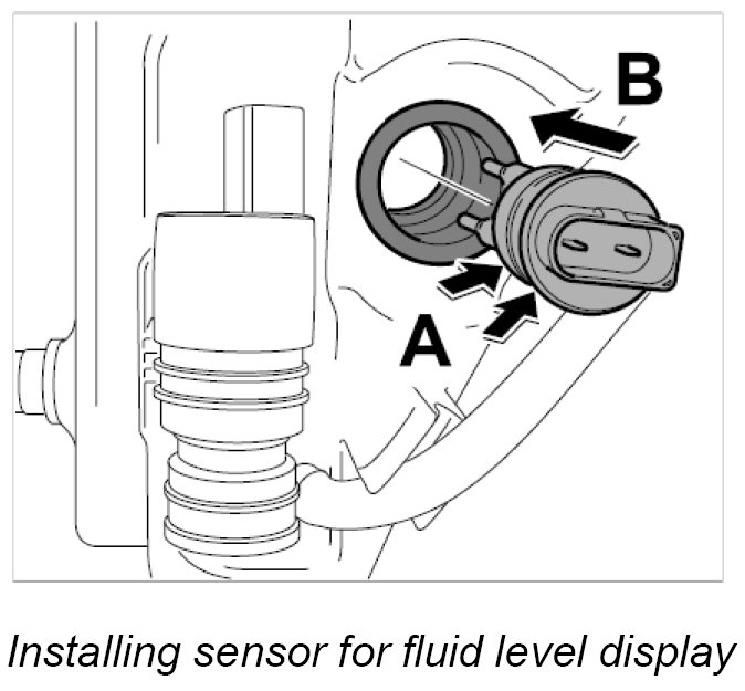 2. Apply a suitable rubber lubricant (tyre mounting paste) to the sealing surface -arrows A- and press the sensor for fluid level display into the rubber seal -arrow B- until the sensor is felt to engage.