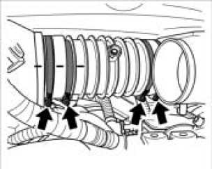 5. Loosen the four screw-type hose clamps of the tuning pipe on the rubber sleeves to the side intake distributors -arrows- and push the rubber sleeves onto the intake distributor pipe as far to the side as possible.