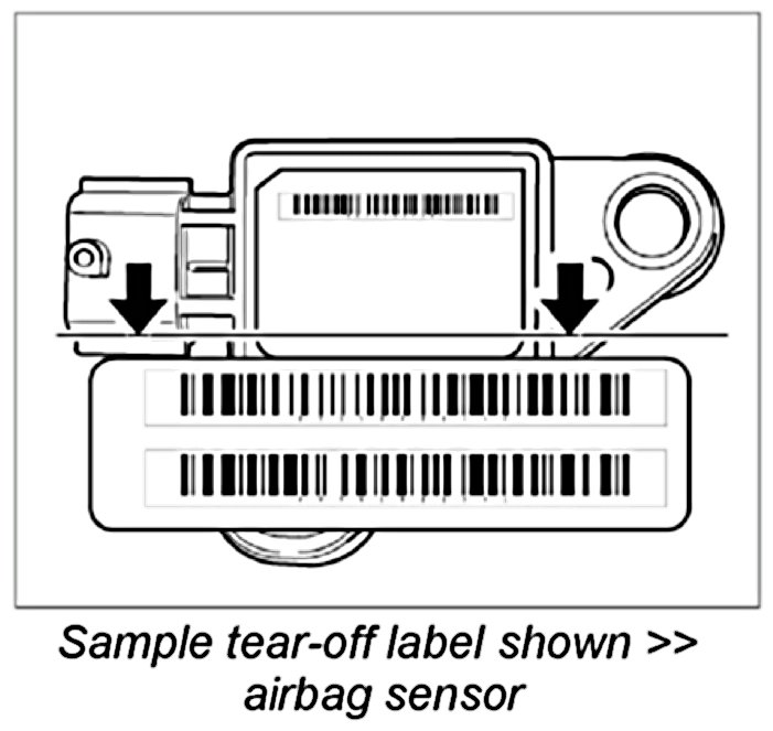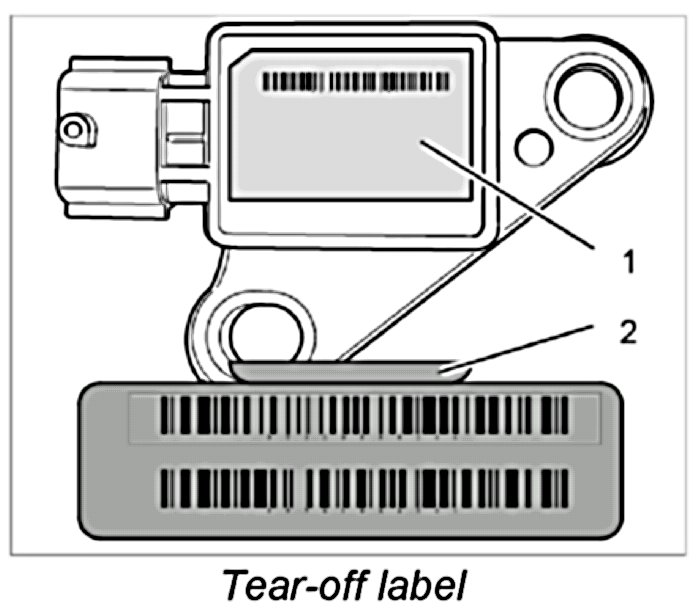 NOTE: If a new component (e.g. sensor, airbag control unit, airbag unit) of the airbag system has to be installed, the new component will be supplied with a barcode sticker (tear-off label).