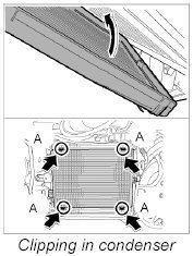 1. Insert condenser into the retaining bracket and clip it into place -A-.