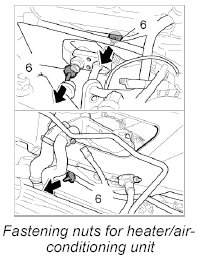 16. Slide the fastening bolts of the heater/air-conditioning unit through the firewall lid and tighten with the three fastening nuts -6-.