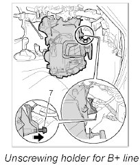 3. Position holder for the B+ line on the heater/air-conditioning unit and tighten with the fastening screw -7-.