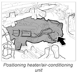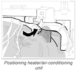 2. Lift heater/air-conditioning unit over the centre console and position under dashboard bracket.