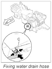 7. Check water drain hose for damage; if drain hose shows no sign of damage, connect hose to the drain on heater/air-conditioning unit and fix with the clamp -C-.