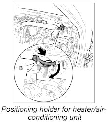 9. Guide holder -B- for the heater/air-conditioning unit over the dashboard bracket, push through the mounting of the heater/air-conditioning unit and turn through 90°.