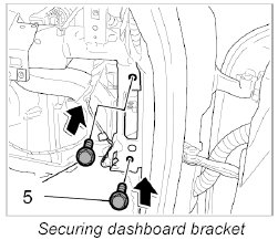 7. Unscrew the two fastening screws -5- for dashboard bracket to right side of body.