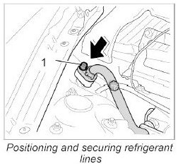 18. Replace sealing rings for refrigerant lines and wet with refrigerant. Position refrigerant line and tighten with fastening screw -1-. - M8: 14 Nm (10.5 ftlb.)
